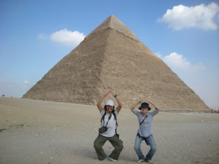(カフラー王のピラミッドの前でポーズを決めるしょぺヶ原夫妻)