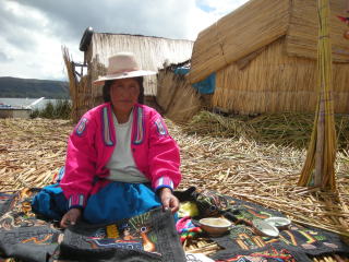 ウロス島を訪れた時はまだまだ曇り ウロス島で土産を売る派手な島民