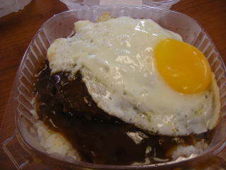 ロコモコ。米の上にハンバーグとタレ、その上に目玉焼きを