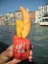 ヴェネツィアの運河をバックにフルーツの食べ歩き。
