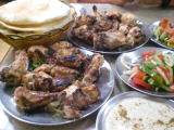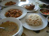 野菜のトマト煮、チキン、スープ、タヒーナ、サラダ、味付きごはん、パン。 |