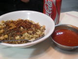 ここではまずチョリソを注文。続いて隣の人が食べていたこの焼肉のようなものがおいしそうで注文してみましたがなんだか苦手な内蔵系だったかも。でもソースもおいしくて完食でした。 |