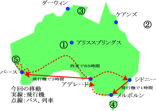 これが大変。なんせ広いですから。地図上で近く見えてもバスで10時間とかあたりまえです。ですので飛行機をうまく使いましょう。飛行機はなるべく早く予約することです。早く予約すると他の移動手段より安くなります。時間も節約できます。バージンブルーかジェットスターが安いですが、機内食等は飲み物も含めて有料です。お菓子を持っていきましょう。ただその広さを実感したいならバスで回るのもいいです。
