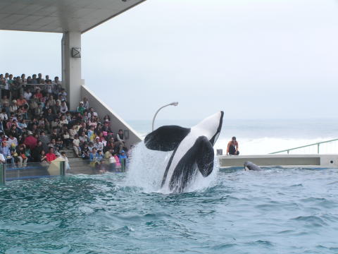 言わずと知れたカモシーこと鴨川シーワールド。イルカやアザラシののショウもあります。シャチのショウのときに前に座るとずぶ濡れになります。 |