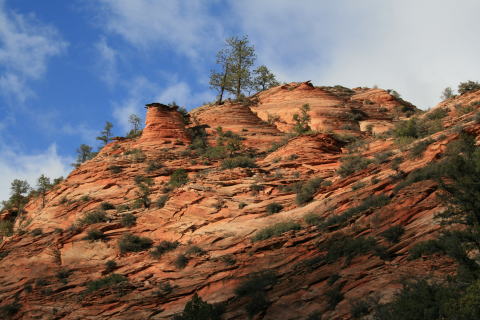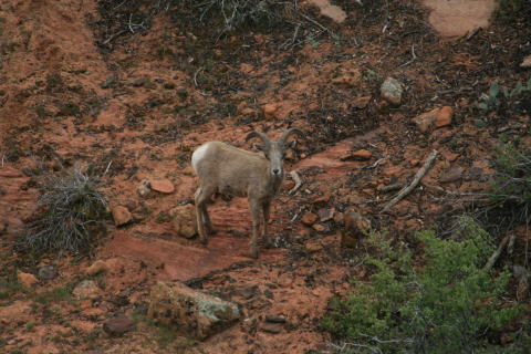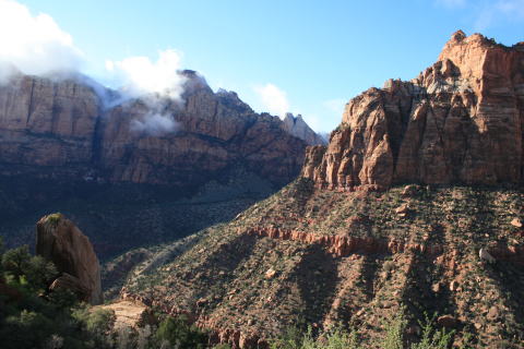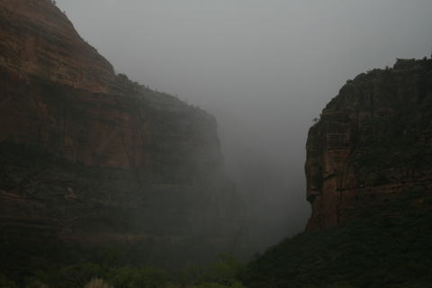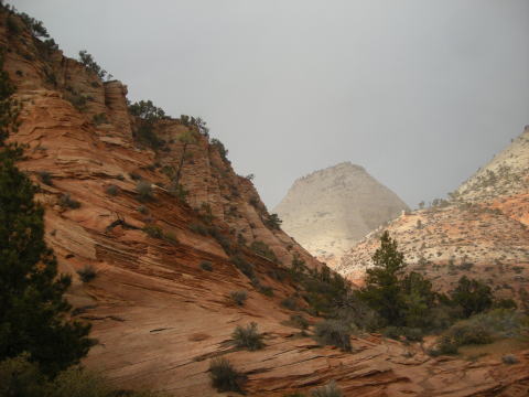 この日はザイオンは快晴ということを天気予報でチェックして、予定を変更してザイオンへ来たのに、写真のように雪が。。。グレート・ホワイト・スローンと呼ばれる白い巨大な岩も全く見えず。 |