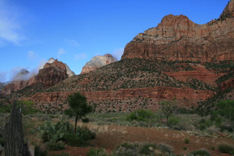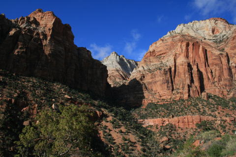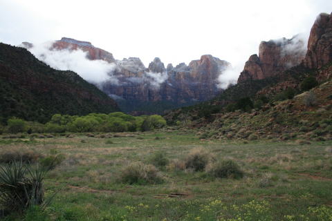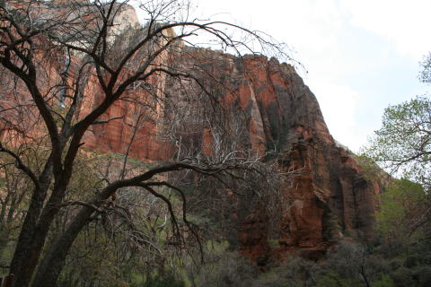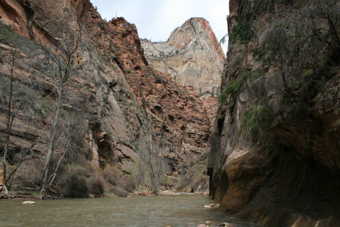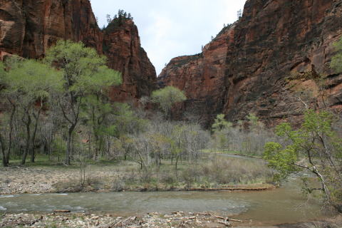ナローズと呼ばれるザイオン奥部。ここから川の中をさらに奥へずぶずぶ歩いて行くとザイオンハイライトの景色が見られるらしいのですが、あいにく4月は水が冷たすぎて無理。しかもこの日はめちゃくちゃ寒かった。 |