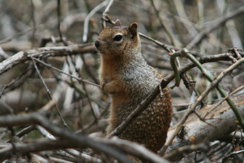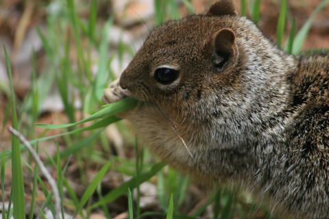 このリスは草を食べてますが、人間に近づいて来るということは人間が餌をあげているということでもあります。国立公園では野生動物に餌をあげることは法律違反ですが、それでもあげている人もいます。 |