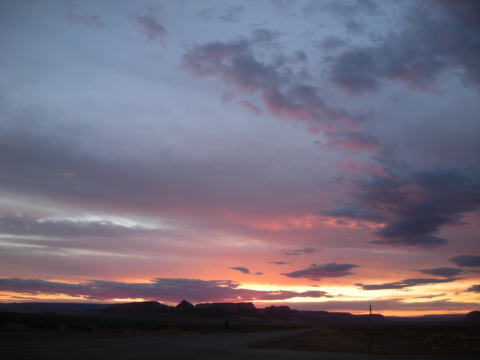 モニュメントバレーへ向かう途中の道。晴れ間がちょっと見えたので停車し1枚。遠くにビュートが見え始めた。かっこいい!