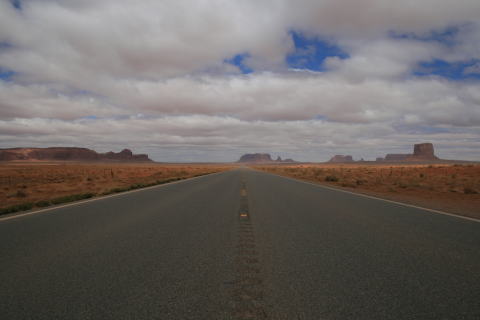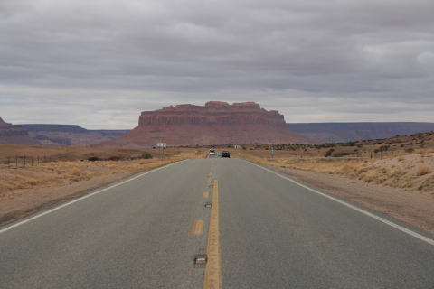 ペイジからモニュメントバレーへ向かう途中の道。連日当たっていない天気予報では、今日も晴れると言っていたが、曇ってます。晴れてくると信じて車を走らせる。巨岩へ吸い込まれて行く道がかっこいい。