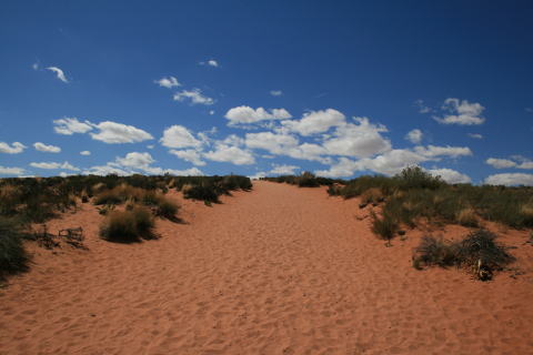 川が刻んだ小さな峡谷アンテロープキャニオン。非常に狭い峡谷を降りて行くと幻想的な世界が広がっています。写真は入口。嫁を立たせると非常に狭いことがわかります。 |