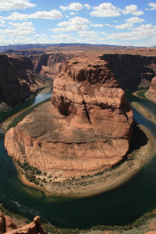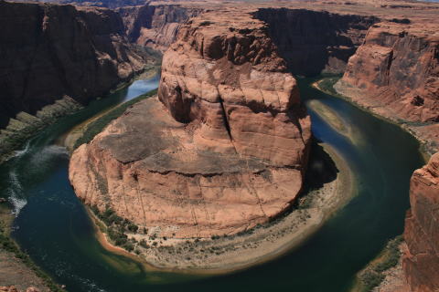 写真に収めるにはヘリやセスナに乗るしか・・・。ちなみに周りを流れるコロラド川までの高さは数百mはあるかと。柵も何もないためちょっとこわい。この岩をコロラド川がどれくらいの期間をかけて造ったことか。今も少しづつ削り取っています。 |