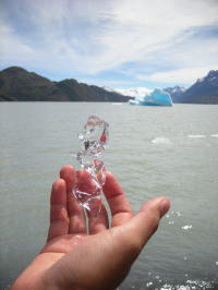 氷河の氷はものすごい圧力で出来ているため、非常に透明度が高く硬い(写真左)。食おうとしたら食えなかった。