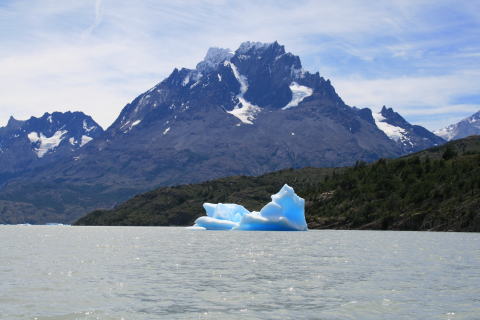 パイネ国立公園最高峰のパイネ・グランデ山。その前に湖に浮かぶ氷塊。