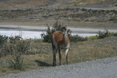 グアナコ。ラクダのようなカンガルーのような・・・。周辺にはピューマやハイイロギツネも生息しています。 |
