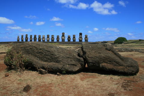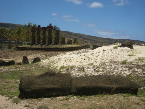 15体のモアイの正面で1体倒れたままになっているモアイ。他のモアイが立て直されているのにちょっとかわいそう。 |