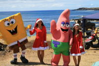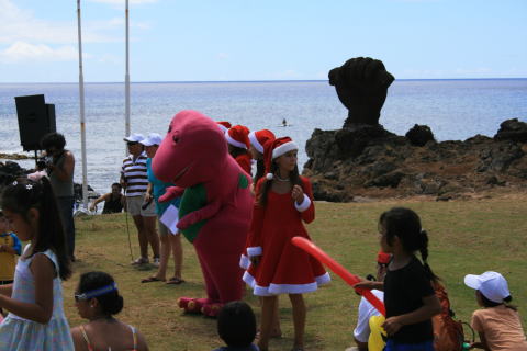村の海辺の広場で子供向けのイベントをやってました(クリスマスイベント?)。気温はおそらく30度を超えていたかと思いますが、着ぐるみを着て踊りまくる怪獣が子供たちにばれないように、口をあけて、ぜぇぜぇやってたのが切なかった。 |