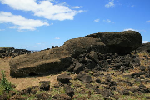 テ・ピト・クラの近くに倒れているモアイ。アフ(台座、祭壇)に立たされた最大のモアイ。全長9.8m、74トン。
