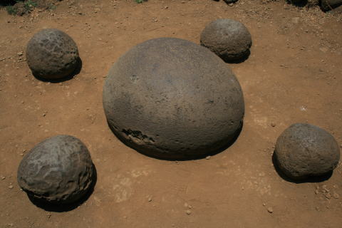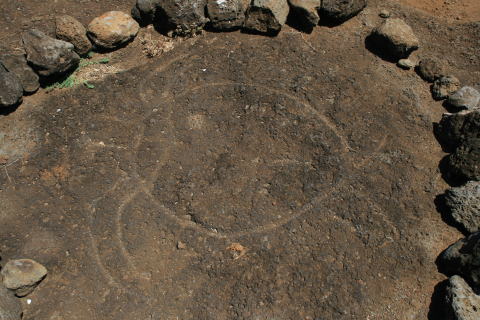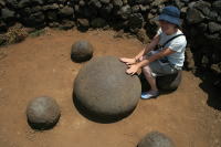光のへそと呼ばれているまるっこい石。重さ82トンで磁場がある。イースター島に最初にやってきたホツマツア王が故郷から持ってきたとも言われているが果たして・・・。 |