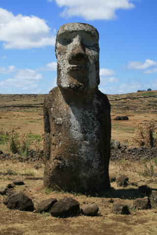 15体のモアイの近くに1体だけで立っているモアイ。1982年に東京、大阪に来日した経験があるとのことです。 |