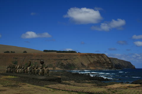 こちらもアナケナビーチの前に立つ7体のモアイ。1978年復元。砂に埋もれていたため、保存状態が非常によく、体の模様もよくわかりました。復元時にここでモアイの目が発見された。