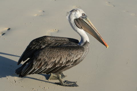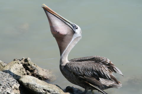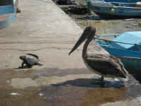 ウミイグアナと並んでかなりよく見るコイツ。翼を広げると2mにもなる。でもペリカンの中では世界一小さいらしい。 |