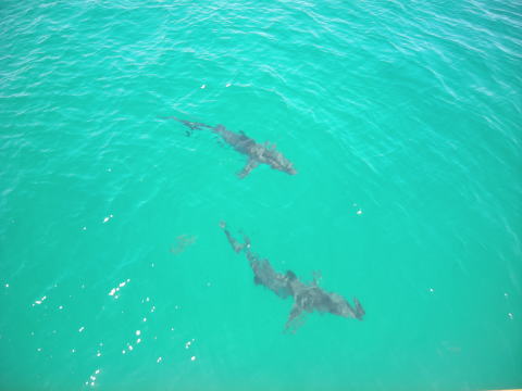 ノース・セイモア島の周りにはサメもいっぱい。シュノーケルで一緒に泳ぐこともできます。危険はないようです。 |
