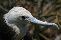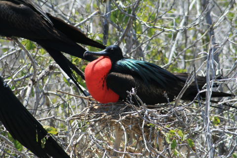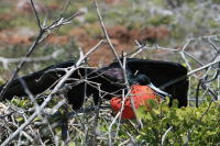 ガラパゴスにはオオグンカンドリとアメリカグンカンドリの2種がいて、雄は背中の羽が緑に輝くのがオオグンカンドリ(左写真)、紫がかっているのがアメリカグンカンドリ(上写真)。雌は眼の周りが赤いのがオオグンカンドリ、青いのがアメリカグンカンドリ。 |