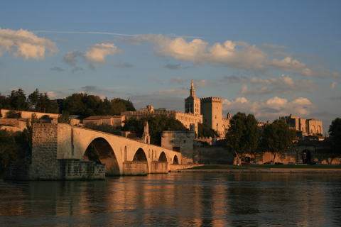 川の対岸から見たベネゼ橋と法王庁宮殿。夕日に照らされてほんのり赤く染まっています。 |