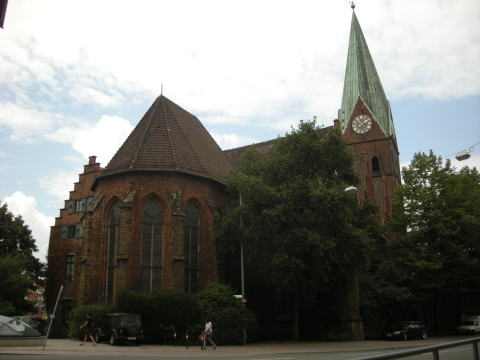 正面からだと大きすぎて写真におさまらない。双塔の高さは157mで、ヴァチカンのサン・ピエトロ大聖堂(132.5m)より高い。スペインのサグラダ・ファミリアは、完成時には170mになるらしいが、現在のところ最も高い聖堂はここ(だと思います)。 |