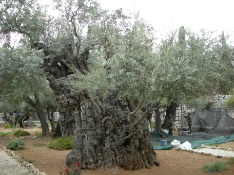 ゲッセ・マネとはへブライ語で「油絞り」の意。現在8本のオリーブの木があり、それは当時から受け継がれてきたもの。かなりの大きさです。