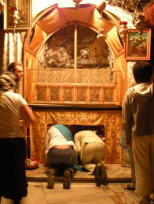 エルサレムから南に10kmの小高い丘にの上にある聖地ベツレヘム。ヘブライ語で「パンの家」、アラビア語で「肉の家」の意味。教会内にある小さな洞窟の中にはイエスが生まれたとされる場所に銀の形がはめ込まれた祭壇があり、教徒が熱心に祈りを捧げています(右上の写真)。