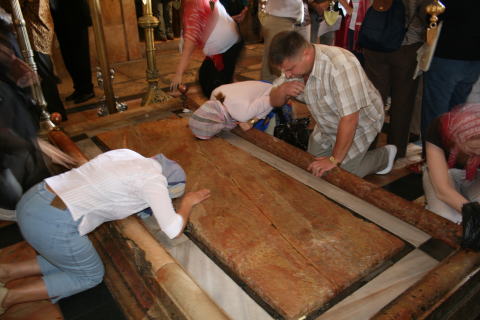 塗油台に祈りを捧げる教徒。イエスの聖骸に香油を縫った大理石板です。