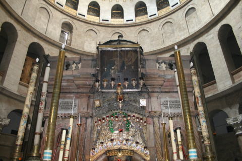 イエスの墓のある教会。内部にはチャペルがたくさんあり、カトリック、アルメニア、コプト、ギリシア正教などの各派が区分管理しています。