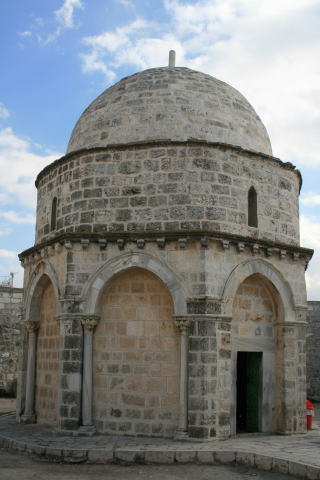 オリーブ山に建つ昇天教会。教会内部にはイエスがつけたとされる足跡があります(右)。