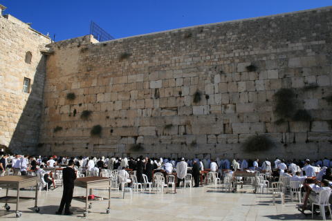 壁に詰まっているのは教徒の願いを記した紙切。夜露が落ちてくるのがユダヤ人が泣いているようであることから嘆きの壁と言われるようになった。 |