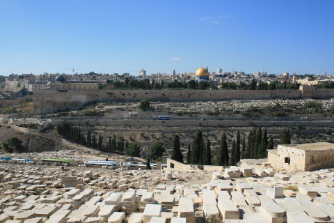 オリーブ山からエルサレムを一望できます。手前の無数の石はユダヤ人の墓。最後の審判の際に死者がオリーブ山で復活すると言われていることからここに多くの墓があります。 |