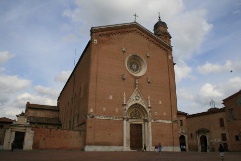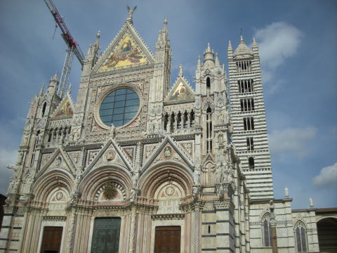 シエナのドゥオモ。外壁を飾る大理石の縞模様と正面のピンクと白の大理石は独特でかわいらしい。 |
