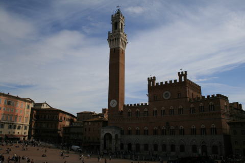 ブッブリコ宮とマンジャの塔。カンポ広場に面して建っています。マンジャの塔の高さは102m。 |