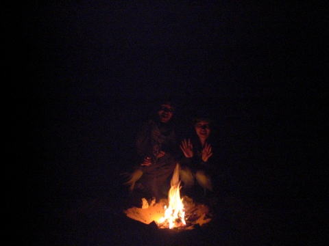 月明かりの中焚き火。砂漠の夜はかなり冷え込みます。でもこんなところでも猫が飼われていました。 |