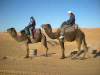 ラクダに乗っていざ砂漠の中へ。砂漠の遊牧民ベルベル人の案内で片道2時間。最初楽しかったラクダもずっと乗ってるとケツが痛い!! |