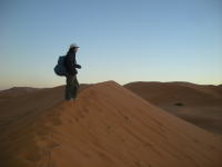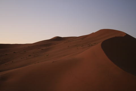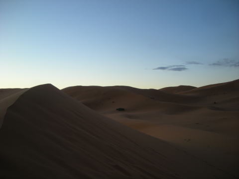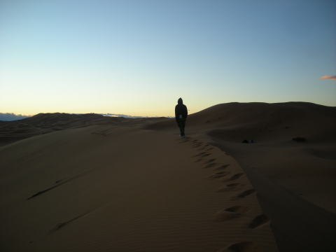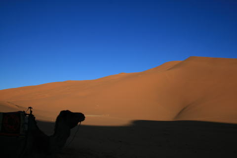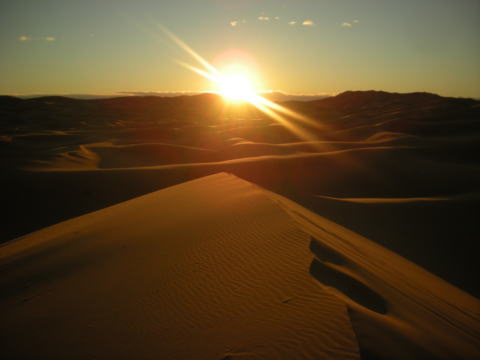 夕日に照らされる砂漠。風もなく、全く音のない世界。突き刺さる静寂がちょっと怖い。聞こえるのは自分の呼吸と鼓動。生きていることを実感できます。