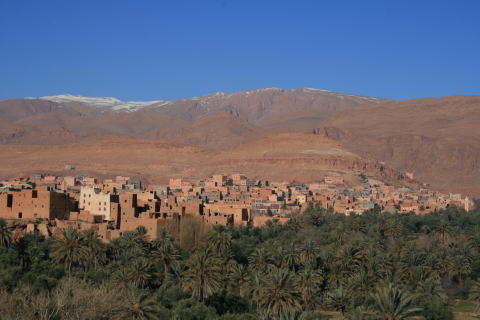 トドラからメルズーガへ向かう途中、雪化粧をしたアトラス、日干しレンガのクサル、オアシスのコントラストがきれいでした。