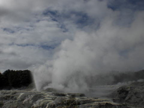 間欠泉が噴出してます。1日10回くらいあるらしい。風下に行くと雨のように降ってきます。でも入場料が高かった。。。 |