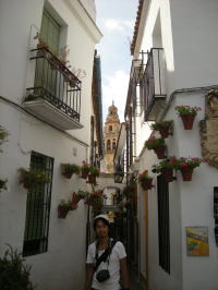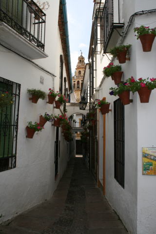 白壁に花の鉢がたくさん飾られた路地。メスキータも顔を覗かせています。 |