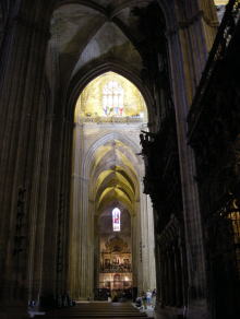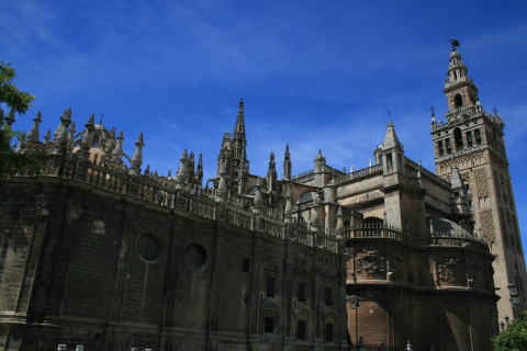 ひときわ目立つ大聖堂とヒラルダの塔。この中にコロンブスの墓もあります。ミナレットの高さは98m。大聖堂の前身のモスクのミナレットを転用して建てられた。ミナレットの高さは世界一(だと思います)。 |