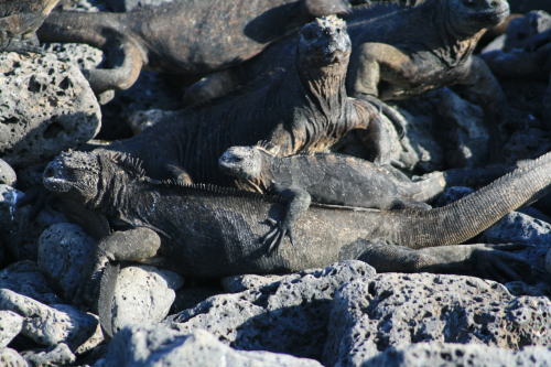 岩場にたくさんいるウミイグアナ。子供は親の背中に。かわいいようでかわいくない。 |