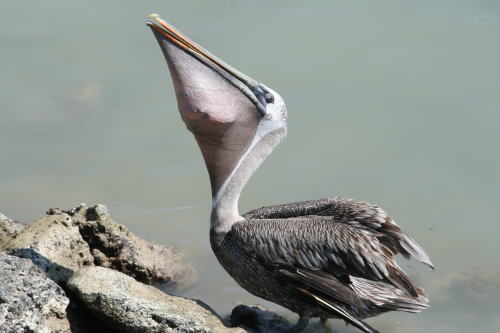 どの島にもいるペリカン。こいつもかなり近づけます。体長は結構大きく、翼を広げると3mにもなるとか。写真は魚を飲み込む瞬間。 |