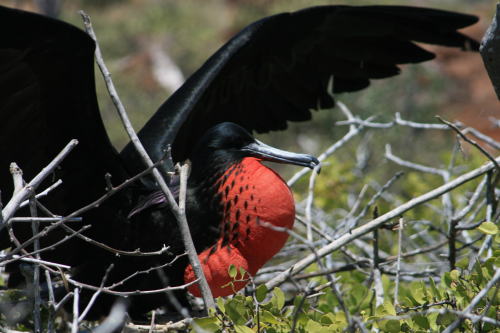 繁殖期になると雌の気を引くため赤い喉の袋を膨らませるグンカンドリ。訪れた時期がよかったため見ることができました。
